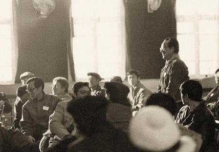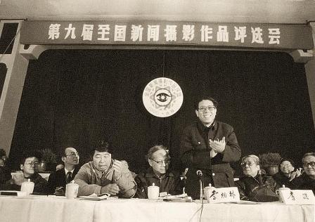 (07-1)第九届全国新闻摄影作品评选会议1990年1月10日至15日在吉林市举行。这次评选会议坚持了正确的学术方向,评出了准确反映1989年那场政治风波性质的《不要砍了》(解放军画报李靖摄)等四幅作品获金奖,表现出了很高的评选水平。这是中共吉林市委书记李相林在开幕式上致欢迎词。前排就座的是:朱焕军(右一)、李准(右二)、许必华(右四)、舒野(右五)、徐佑珠(右六)。 梁文骏摄