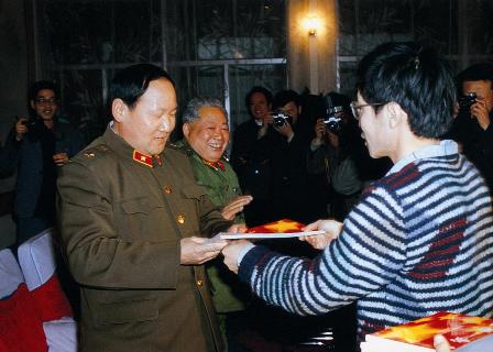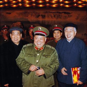 (05-1)第六届全国新闻摄影作品评选 1987年3月14日至19日在沈阳举行时,沈阳军区政委刘振华同罗光达、蒋齐生、林廷松等步入评选会议会场。李正丹摄