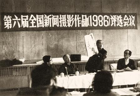 (05-3)在第六届全国新闻摄影作品评选会议上,评委会主任蒋齐生对获奖作品发表意见。左二罗光达,右一蒋少武,左一胡颖。
