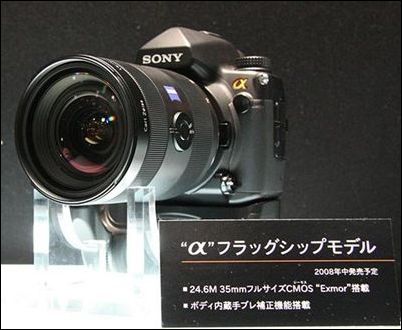在PIE2008展上亮相的索尼α900全画幅单反,采用2460万像素CMOS,具备机身防抖