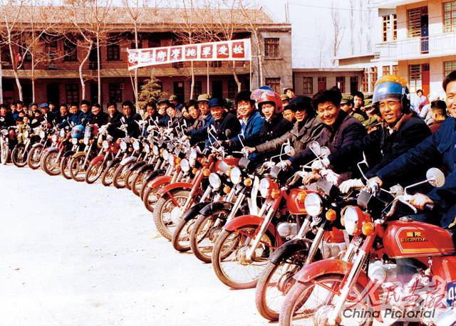 河南省灵宝县农民自发组织农村摩托车赛。20世纪80年代,随着改革深入,农民日渐富裕起来,许多人家里购置了摩托车以代替自行车。 摄影 张海龙 贾铁