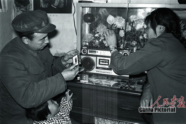 1981年,青海草原上,马成雄一家三口正在调试新添置的一台收录两用机。摄影 王精业/新华社