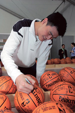 2007年2月17日,在美国拉斯维加斯的NBA全明星周末上,姚明在纪念篮球上签名。