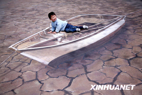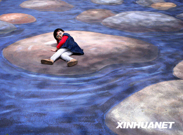 近日,南京玄武湖公园的地面上出现了30多幅三维空间立体画。游人只要站在这些立体画的特定位置,按照特定角度与画作合影,就能拍出立体感很强的照片。新华社发(王新 摄)