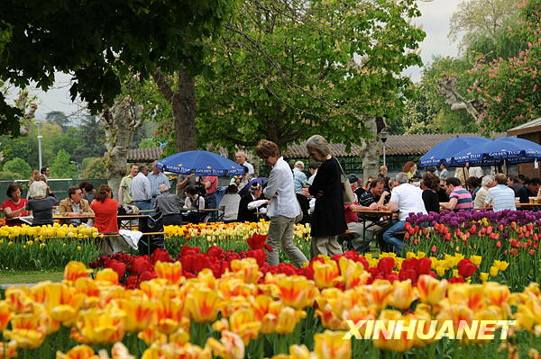 5月2日,前来瑞士莱蒙湖畔小城莫尔日欣赏郁金香的游客络绎不绝。新华社记者杨京德