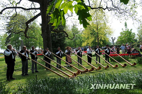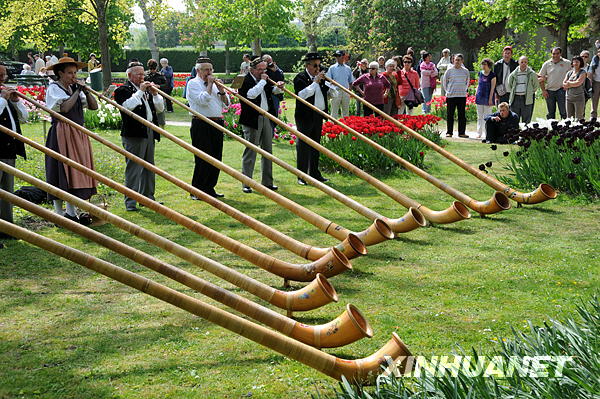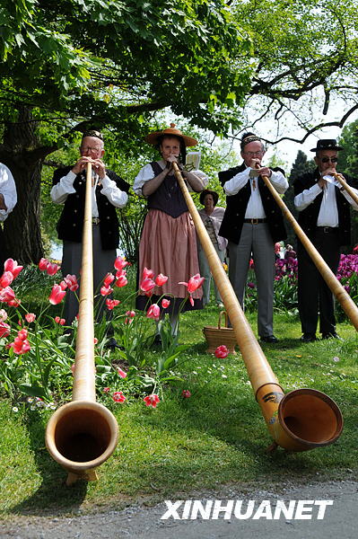 这是在瑞士莫尔日市举办的郁金香节上进行的阿尔卑斯长号表演(2009年5月3日摄)新华社记者杨京德
