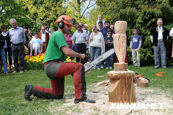 5月3日,游人在瑞士莫尔日举办的郁金香节上欣赏电锯雕刻表演。新华社记者杨京德