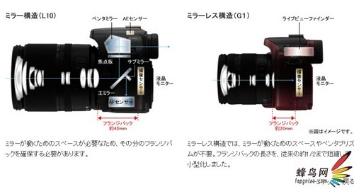 该产品的成像结构与传统4/3系统单反相机相比要简化很多,完全电子化