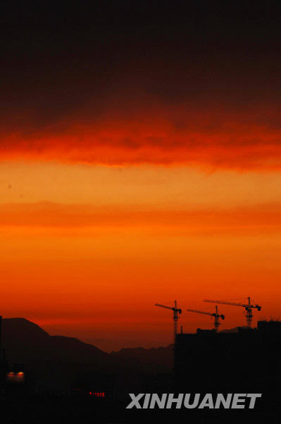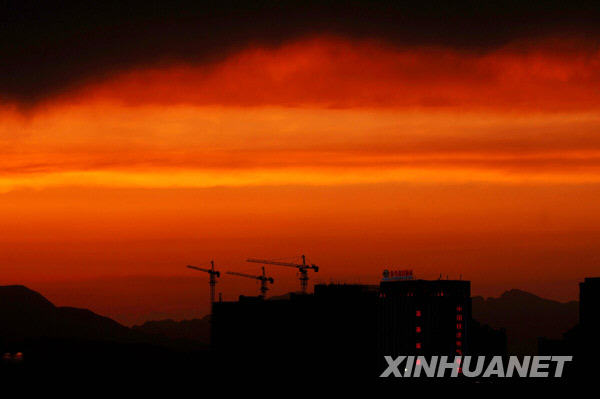 火烧云是一种自然现象。通常出现在清晨日出、傍晚日落时分,天边的云彩一片通红,仿佛火烧一般。新华社记者尹栋逊摄