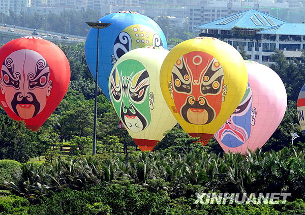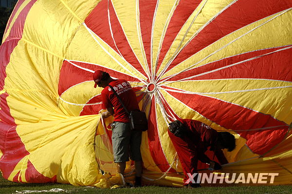 6月12日,热气球运动员在??谑型蚵淘敖斜硌萸暗淖急腹ぷ鳌5比?,2009第三届海口热气球节暨H1中国热气球挑战赛在??诶∧?,共有25支热气球队参加此次为期四天的比赛。新华社记者赵颖全摄