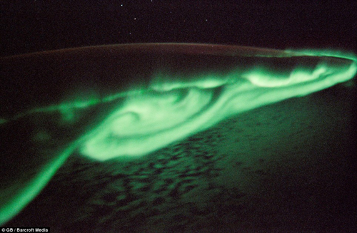 在两极上空大气层以上数十公里的太空,极光现象仍能被清楚地观测到。红色、绿色的极光闪烁着怪异的微弱绿光,好似鬼怪之光,给人以寒冷的感觉。在绕地轨道上的宇航员用长曝光相机和35毫米胶片拍摄下了这些怪异的图片。