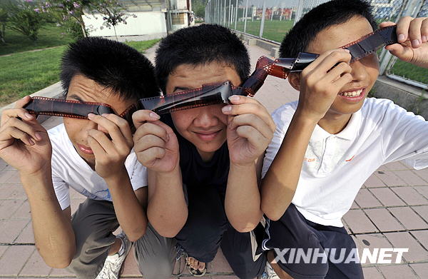 7月22日,三位中学生在济南体育中心用胶卷观看日食奇观。