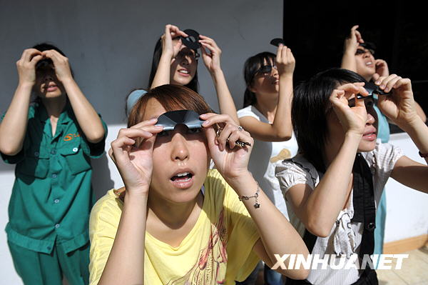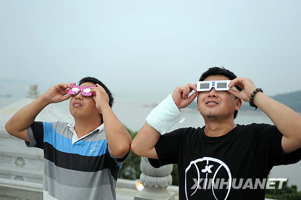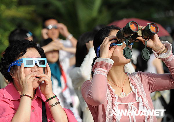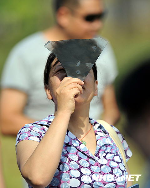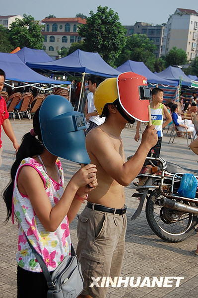 7月22日,昆明市民在昆明市东风广场观看日食奇观。新华社记者蔺以光摄
