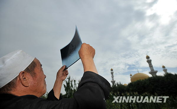 7月22日,银川市永宁县杨和乡纳家户村的农民在田间用X光片观看日食。新华社记者 王鹏 摄