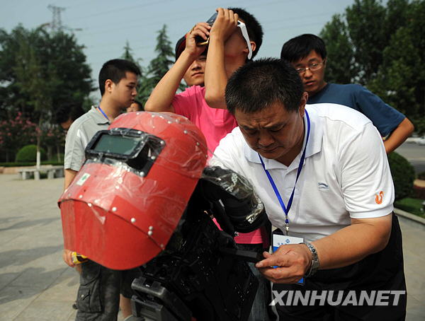 7月22日,一名电视记者用焊工面具罩在摄像机上拍摄日食。新华社记者范长国摄