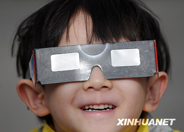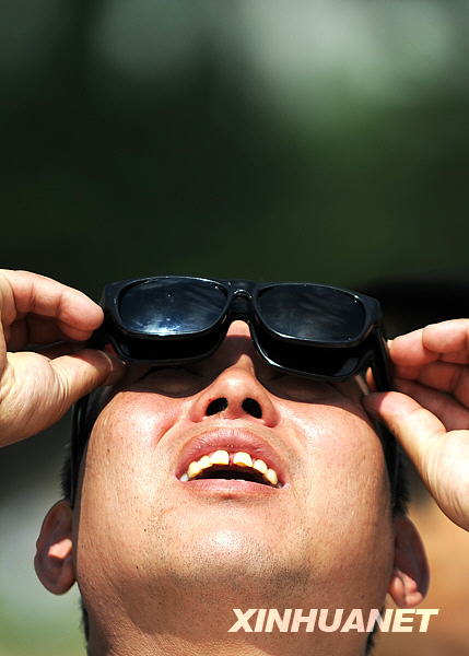 7月22日,长春一位市民透过两副墨镜观赏日食景观。新华社记者徐家军摄