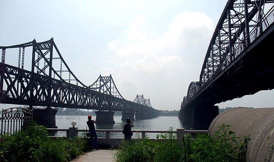 澳门、西藏、沈阳三地摄影家在丹东鸭绿江桥采风。