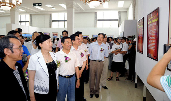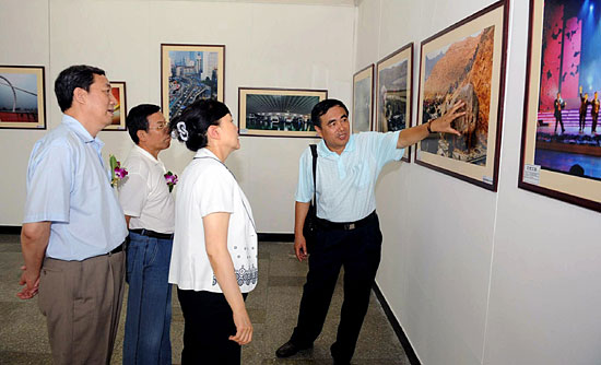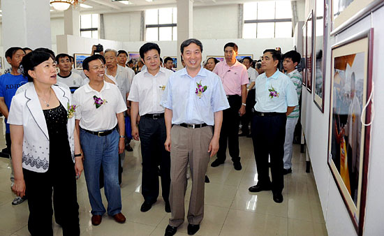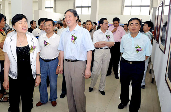辽宁省副省长赵国红(前左一)、中国新闻摄影学会执行主席赵德润(前左二)等领导参观影展。