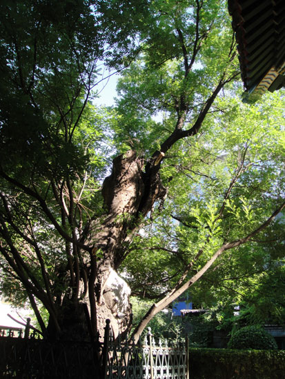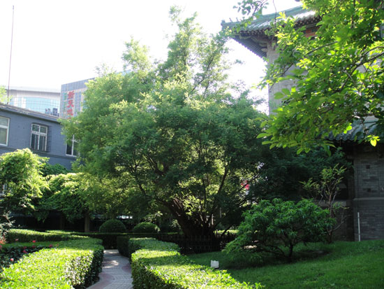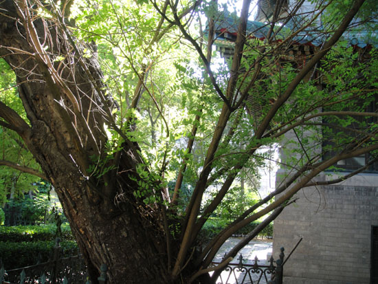 1921年,就在它的身旁,建起了一座当时世界上最先进的协和医学院附属医院。感谢当时的设计师和施工者,没有伤害近在咫尺的老树,而是保留了它。这是老树的福气。也是医院的福气。日月如梭,树老矣,楼房亦老矣。老树、老楼相依相伴,成了形影不离的朋友。夕阳中,老楼飞檐上的琉璃瓦闪着绿光,老槐树浓密的枝叶间射出斑驳的绿影。绿光绿影,一静一动,好不令人赏心悦目!