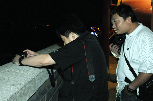 4. 范长江奖获和中国新闻奖获得者、中国新闻摄影学会副秘书长、中国日报摄影部主任徐京星(左)在山海关古城中心钟鼓上拍摄夜景,右为北京晚报资深记者刘平。