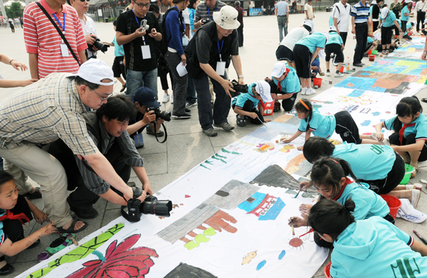 5.人民日报(海外版)总编室副主任、美术摄影部主任赵永琦(左)在山海关古城抓拍桥梁小学学生创作儿童画长卷《爱我家乡》的照片。