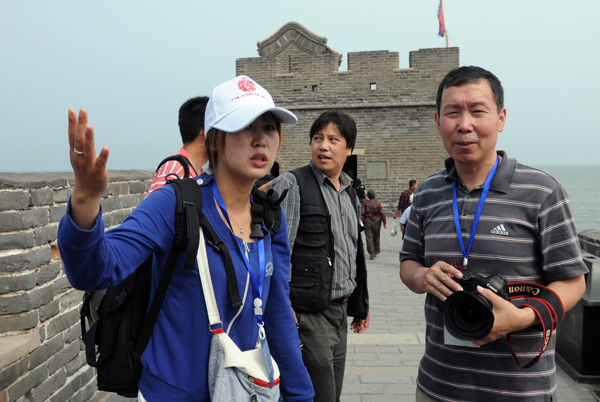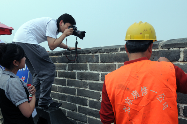 7.荷兰世界新闻摄影比赛、中国国际新闻摄影比赛金奖获得者、新华社高级记者吴晓凌在“天下第一关”城楼前采访。