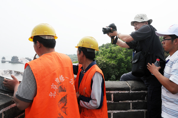 2.全国劳动模范、中国新闻奖获得者、中国国际摄影比赛评委、中国新闻摄影学会副主席、工人日报高级记者于文国爬上山海关老龙头古城墙上拍照。