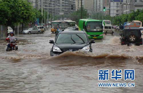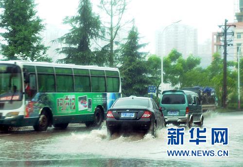 ??? 7月9日,在重庆主城区,汽车在积水中行驶。当日,入汛以来最强降雨开始袭击重庆主城区,随着降雨来袭,重庆天空瞬时暗淡下来。重庆市气象台已发布暴雨三级应急响应。新华社记者周衡义摄
