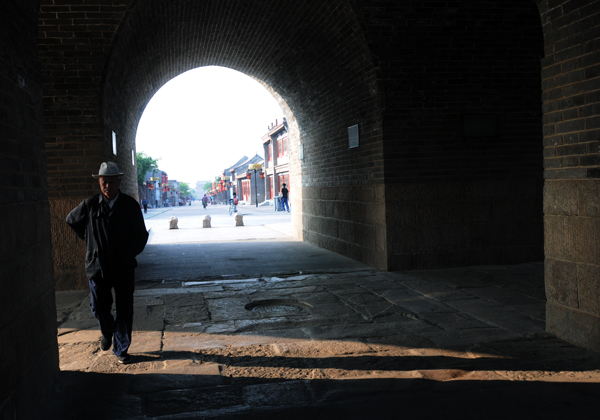 5.?晨光下,一位老人散步穿过山海关古城钟鼓楼门洞。