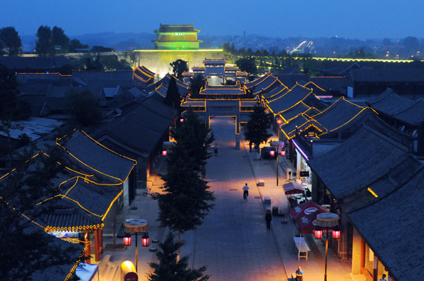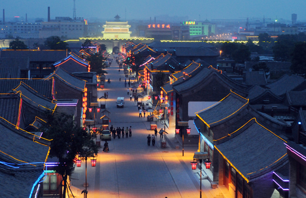 7.?修复改造后山海关古城钟鼓楼南街夜景,远处是复建的古城的南门望洋楼城楼。