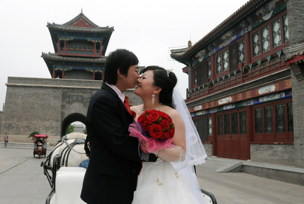 10. 一对新人在山海关古城举办婚礼。