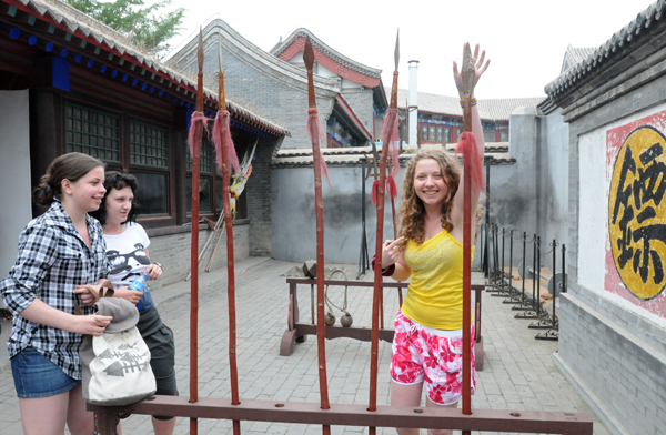 11. 三位来自俄罗斯的游客在古城镖局参观古老的兵器。