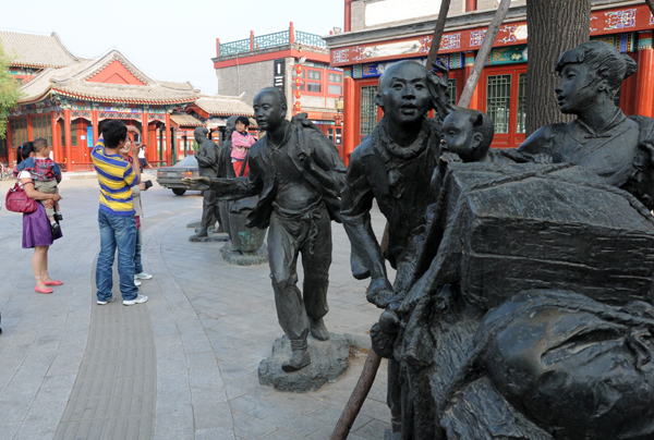 12. 各地游客在山海关古城闯关东的雕塑前拍照留影。