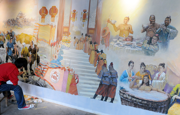 14. 美术工作者为设在古城中的甲申史鉴舘内作画布展。