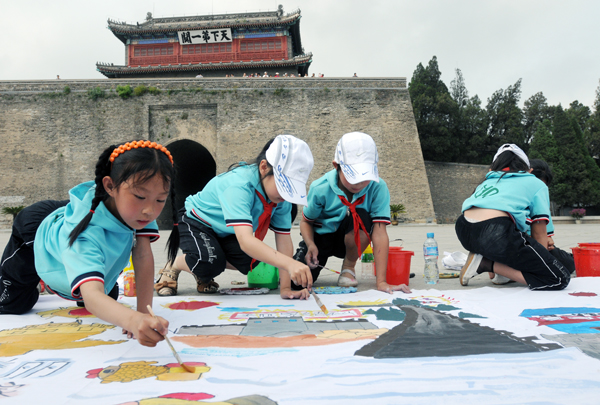 15.中国第五个文化遗产日,山海关桥梁小学学生在天下第一关广场创作儿童画长卷《爱我家乡山海关》,以进一步唤起社会公众的文化遗产?;ひ馐?。