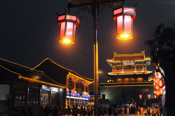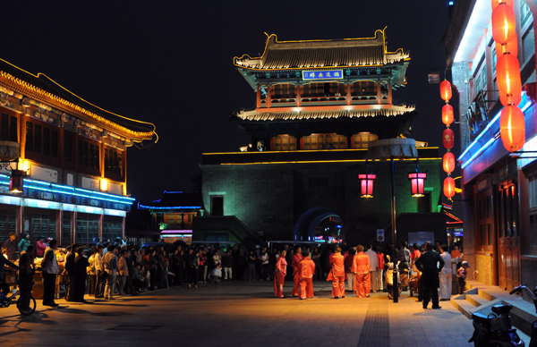 18. 夜幕下游人在钟鼓楼下观看文艺表演。