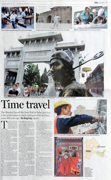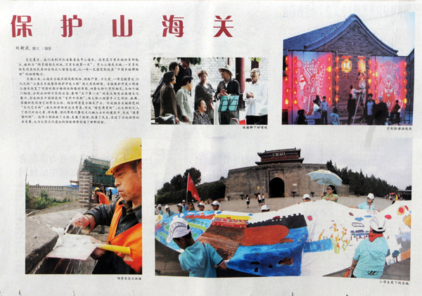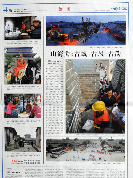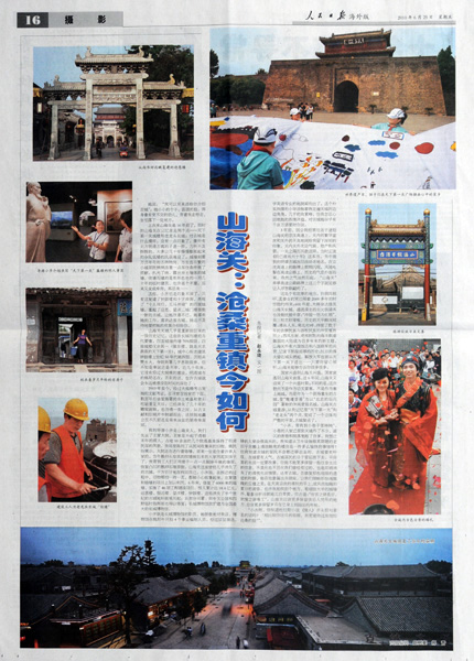 随后,人民日报(海外版)记者赵永琦以《山海关:沧桑重镇今如何》为题,中国日报记者徐景星以《Time travel》为题,人民画报记者唐涛在中英两种刋物以《山海关:凤凰涅槃600年》为题,北京晚报记者刘平以《山海关里的新生活》为题,中国旅游报记者邢光明以《山海关:古城古风古韵》为题,分别以整版篇幅,图文并茂,系统地对山海关长城古城?;た⒆鞒鲎ㄌ獗ǖ?。光明日报记者刘新武在刊发单幅新闻照片后,又用半版篇幅,以《?;ど胶9亍肺饨斜ǖ馈SΩ盟怠肮抑氐忝教迕钦呔劢股胶9毓懦恰钡幕疃且淮纬晒Φ?、比较圆满的新闻摄影采风活动。