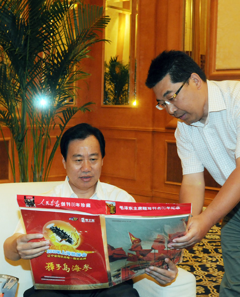 人民画报社常务副总编辑王继雨(右)向中共辽宁省委常委、大连市市委书记夏德仁介绍纪念人民画报创办60年发行的特刊。