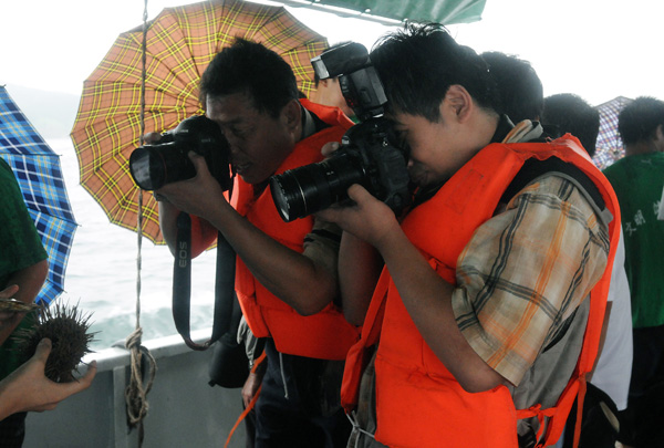 人民画报社采访中心副主任徐汛(右)在快艇上抓拍镜头。