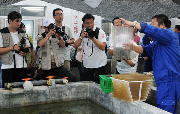 ?????? 荷兰世界新闻摄影比赛、国际新闻摄影比赛(华赛)金奖获得者、新华社高级记者吴晓凌(左),中国新闻社网络图片总监毛建军(左四),京华时报摄影部主任骆永红(左二)等在全国典型生态渔业企业——獐子岛渔业集团的鲍鱼育苗厂拍摄。