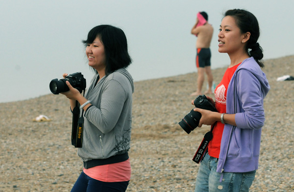 中国青年报记者杨娇(右)、生命时报首席记者胡楚清在大长山岛海边寻找镜头。