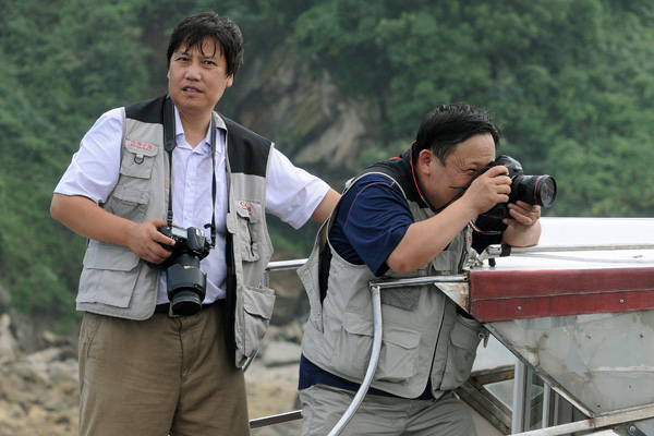 ??????? 荷兰世界新闻摄影比赛、国际新闻摄影比赛(华赛)金奖获得者、新华社高级记者吴晓凌(右),中国新闻社网络图片总监毛建军在船上冒雨拍摄。