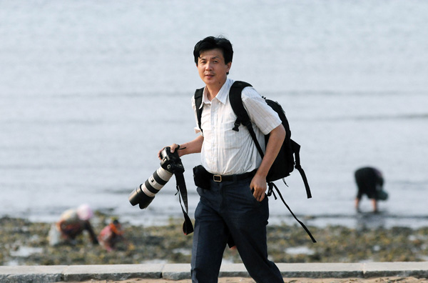 人民画报社专题图库总编辑吴亮在獐子岛海边采访。