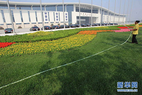 9月13日,一名环卫工人在天津夏季达沃斯论坛主会场梅江会展中心外为草坪花坛浇水。世界经济论坛2010年新领军者年会(简称“夏季达沃斯论坛”)于9月13日至15日在天津召开。来自近90个国家和地区的1500多名与会者将共同探讨“推动可持续增长”这一主题。新华社记者 李明放 摄