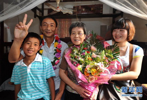 9月27日,詹其雄(左二)和母亲(右二)妻子(右一)及儿子在家中合影。