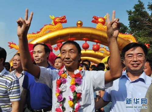 当日,被日方非法抓扣的中国渔船船长詹其雄返回家乡--福建晋江市深沪镇港沪村。当地乡亲热情迎接他归来。 新华社记者张国俊摄