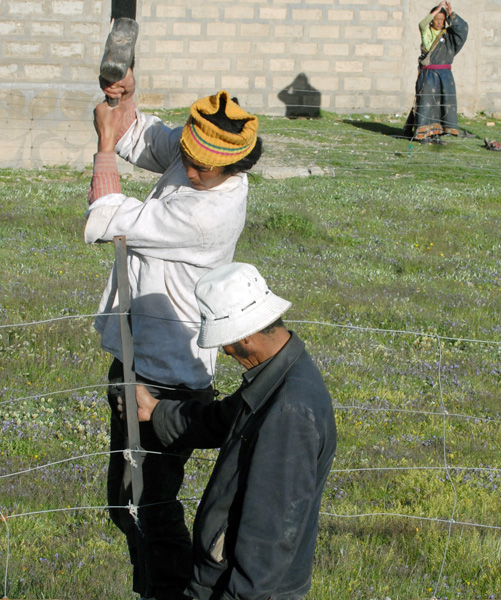 藏族牧民在修建牧场围栏