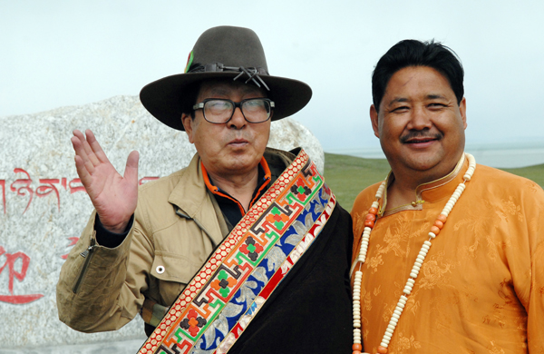 作者胡颖与玛多县委宣传部部长扎洛(藏族)在迎亲滩合影(宋亦增摄)