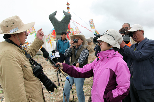 作者胡颖在“黄河源牛头碑”处接受青海电视台记着采访(宋亦增摄)