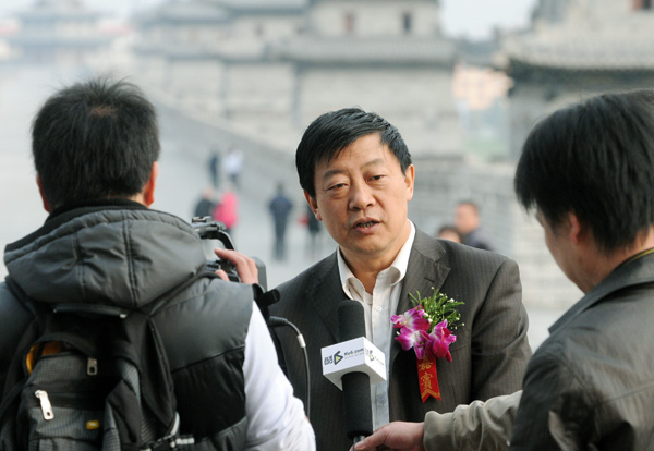 大同市副市长冀明德(中)接受媒体记者采访。